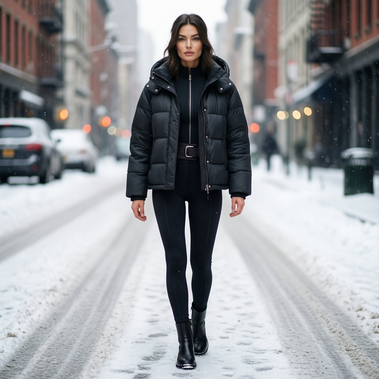 - Контрастные укороченные ботинки + длинный пуховик: визуально "режут" ноги; лучше близкий по тону низ или высокие модели.