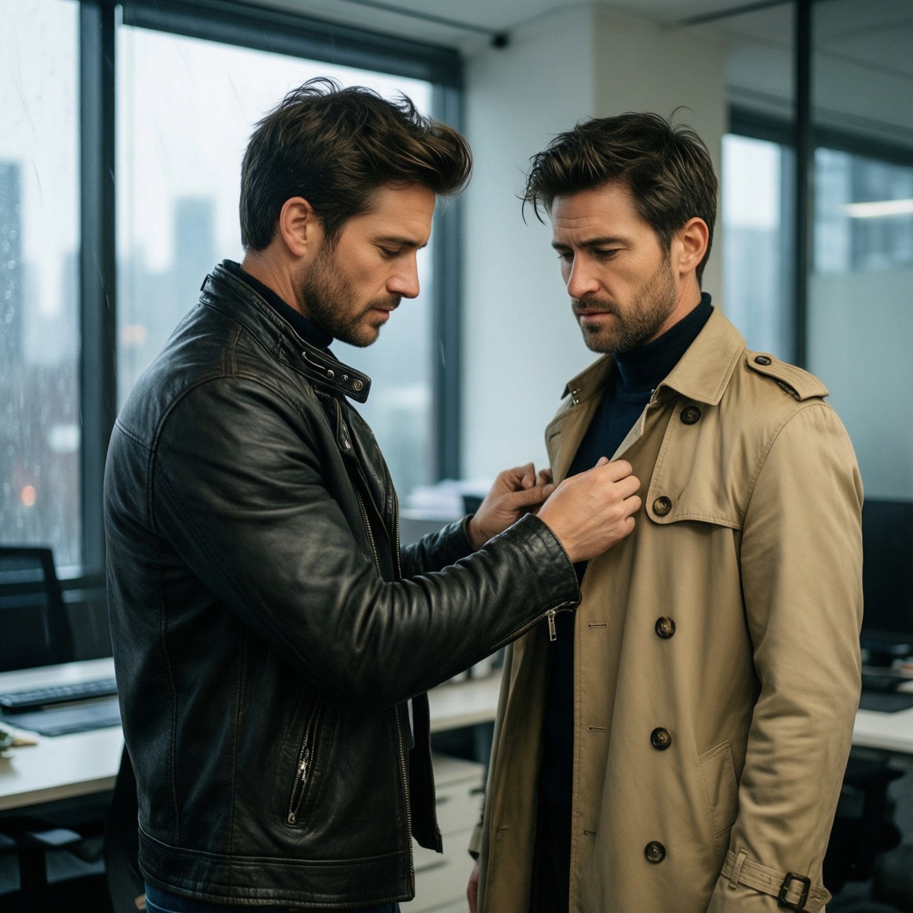 Тренч обычно проще: он нейтральнее и дружит с костюмами и жакетами. Кожаная куртка может работать, но чаще в смарт-кэжуале.