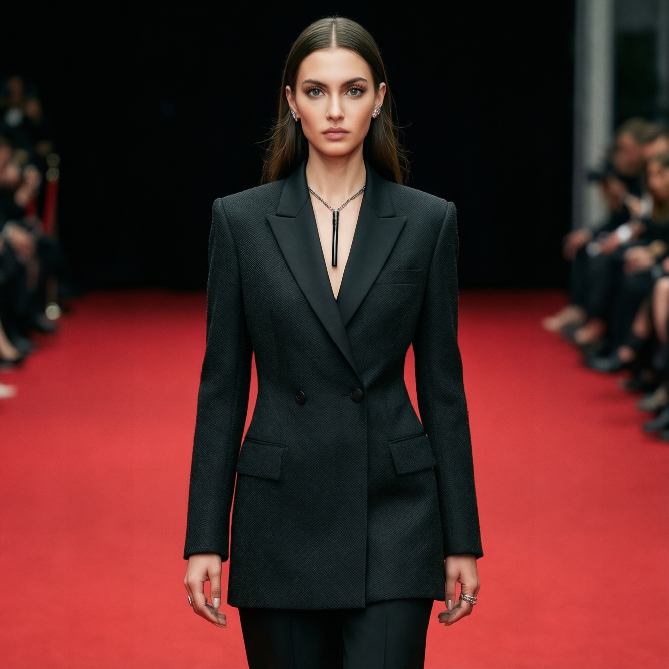 Смокинг Saint Laurent на красной дорожке - это не просто "мужской костюм на женщине", а дисциплина силуэта: чёткая линия плеч, вытянутый лацкан, выверенная талия и длина брюк/юбки, которая визуально удлиняет ногу. Ключевой эффект строится на контрасте строгости и кожи: открытая зона (шея, грудь, спина) компенсируется идеальной конструкцией жакета.