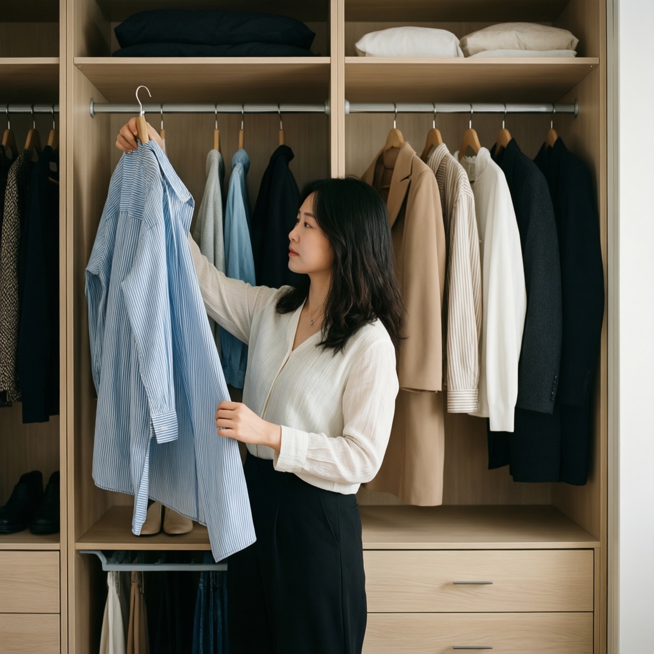 - Список покупок от пробелов: сначала соберите 10 образов из имеющегося, затем докупайте только то, что повторно просится в разные комплекты; это хорошо работает, когда вы учитесь, как составить капсульный гардероб.