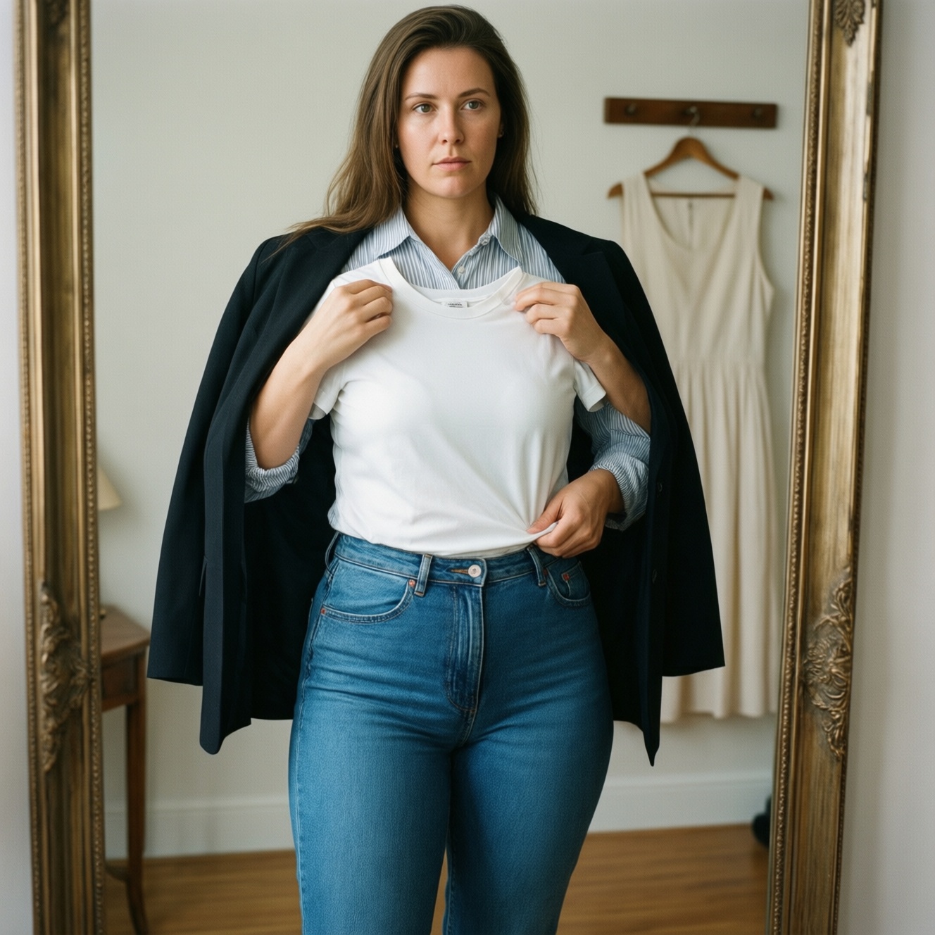Ситуация: клиентка носит джинсы и рубашки, постоянно "правит" посадку и думает, что проблема в размере. Запрос сформулирован как "как понять что одежда не по размеру", потому что вещи то тесные, то мешковатые.