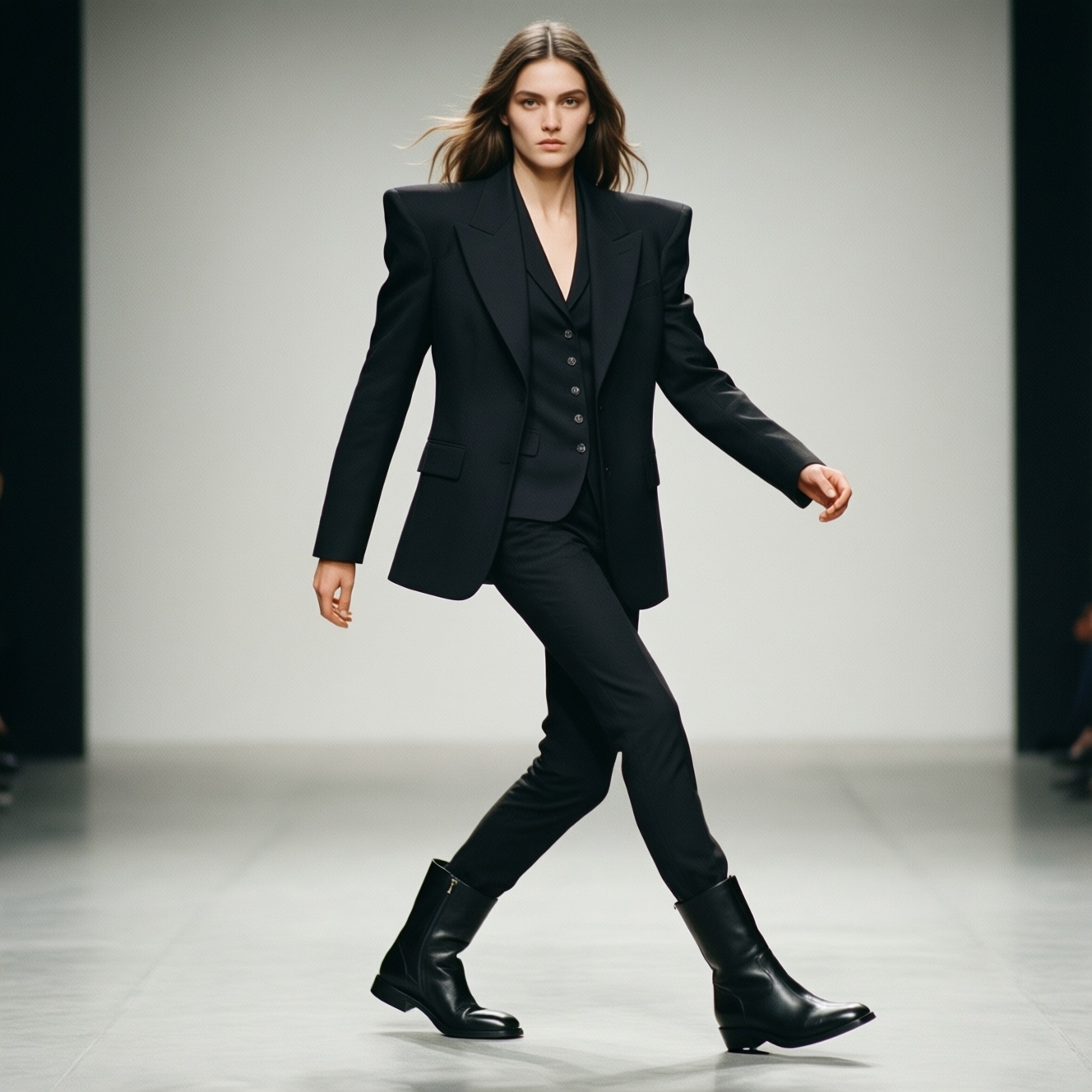 Опорная вещь ансамбля - пиджак: его плечи и длина задают "каркас" и влияют на то, как смотрятся узкие брюки и ботильоны. Типичный для Saint Laurent акцент - чёткая линия плеч и стройнящая вертикаль лацкана, поэтому ошибки в посадке заметны сразу.